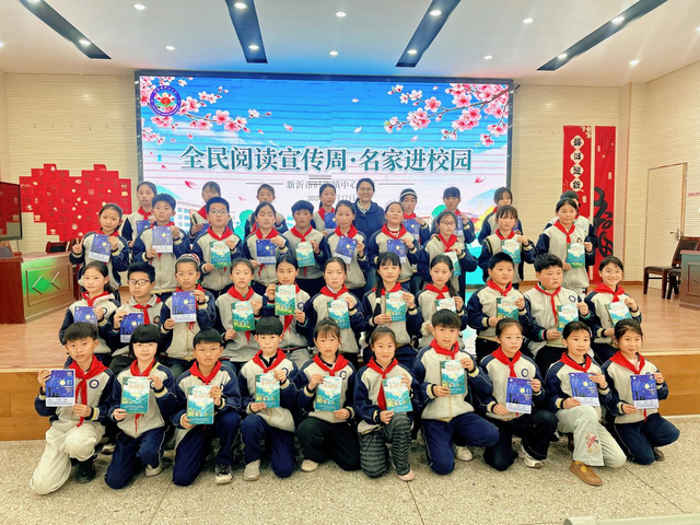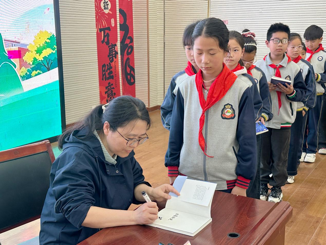 讲座结束后,现场迎来了温馨热烈的签名送书、合影环节。刘黎琼老师为同学们送上精心准备的《他们仨》《小向导》两本优质书籍,并逐一为孩子们签名寄语。孩子们手持书籍,脸上洋溢着激动与喜悦,有序排队与刘老师合影留念,近距离感受名家风采,这份特别的礼物让大家对阅读、对科学有了更深的喜爱与期待。